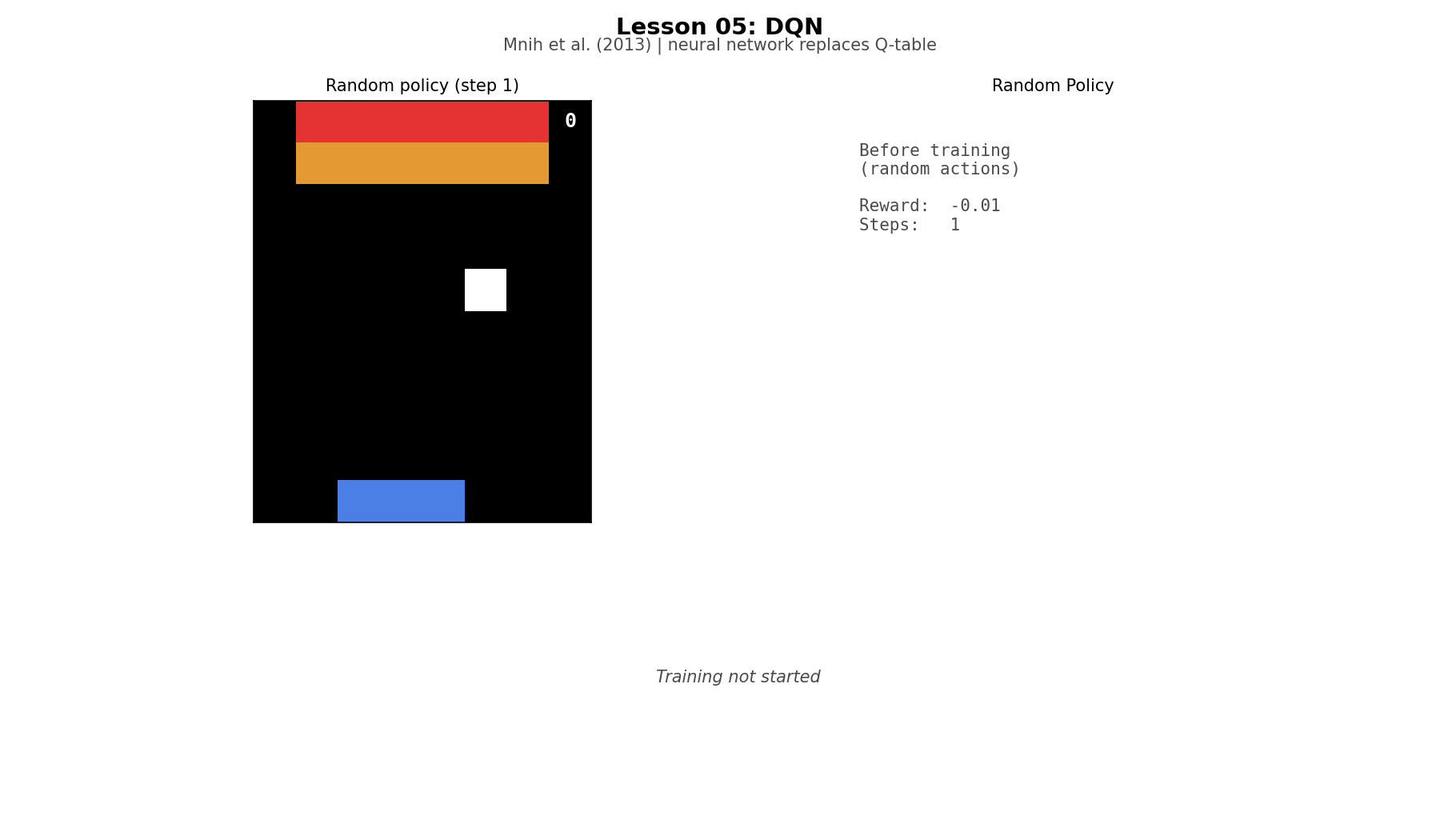 Three ideas make it trainable. Experience replay stores transitions in a buffer and trains on random samples, breaking the correlation between consecutive frames. A target network holds the TD target still long enough for the online network to converge—without it, every gradient step moves the bullseye. Epsilon decay shifts from pure random exploration (filling the buffer with diverse experience) to exploitation (using the learned Q-values) over 200 episodes.