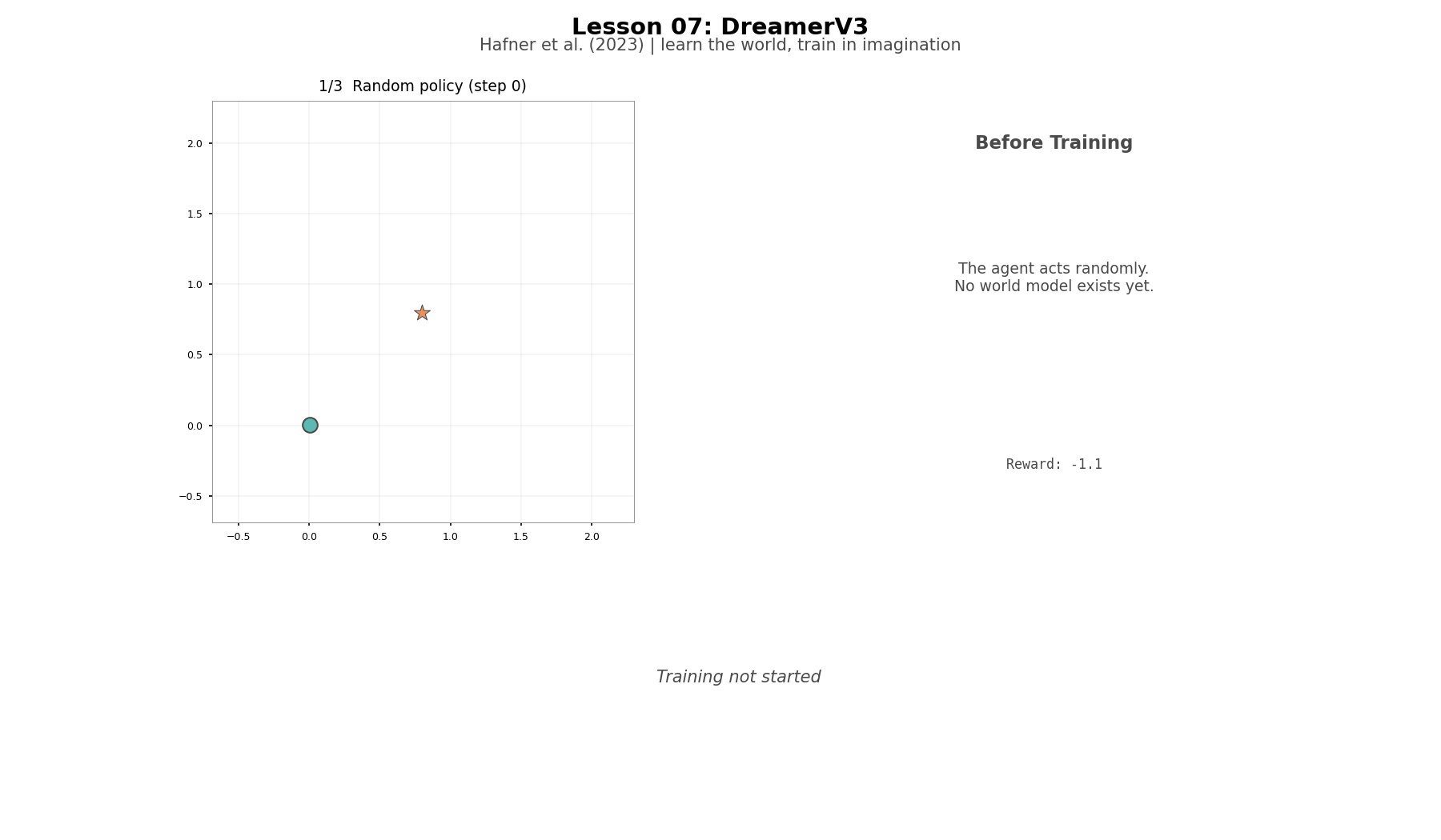 The agent does not reach the target. Training reward reached -30, but greedy evaluation is essentially random. Two things explain the gap. The training reward comes from rollouts where the agent explores—it samples actions from a bell curve, and sometimes gets lucky. The greedy eval always takes the mean action, with no noise to stumble into better positions. And the training reward was a snapshot—the world model and the policy are still changing underneath each other, and by the end of training the policy had drifted from its best point. On top of both, there is an input mismatch: during imagination, the actor trains on the GRU's predicted states, but during real collection and evaluation it sees the encoder's output from actual pixels. These are not the same numbers. The full DreamerV3 solves this with the RSSM, which blends the GRU's prediction with the real observation at every step so the actor always sees a consistent input.