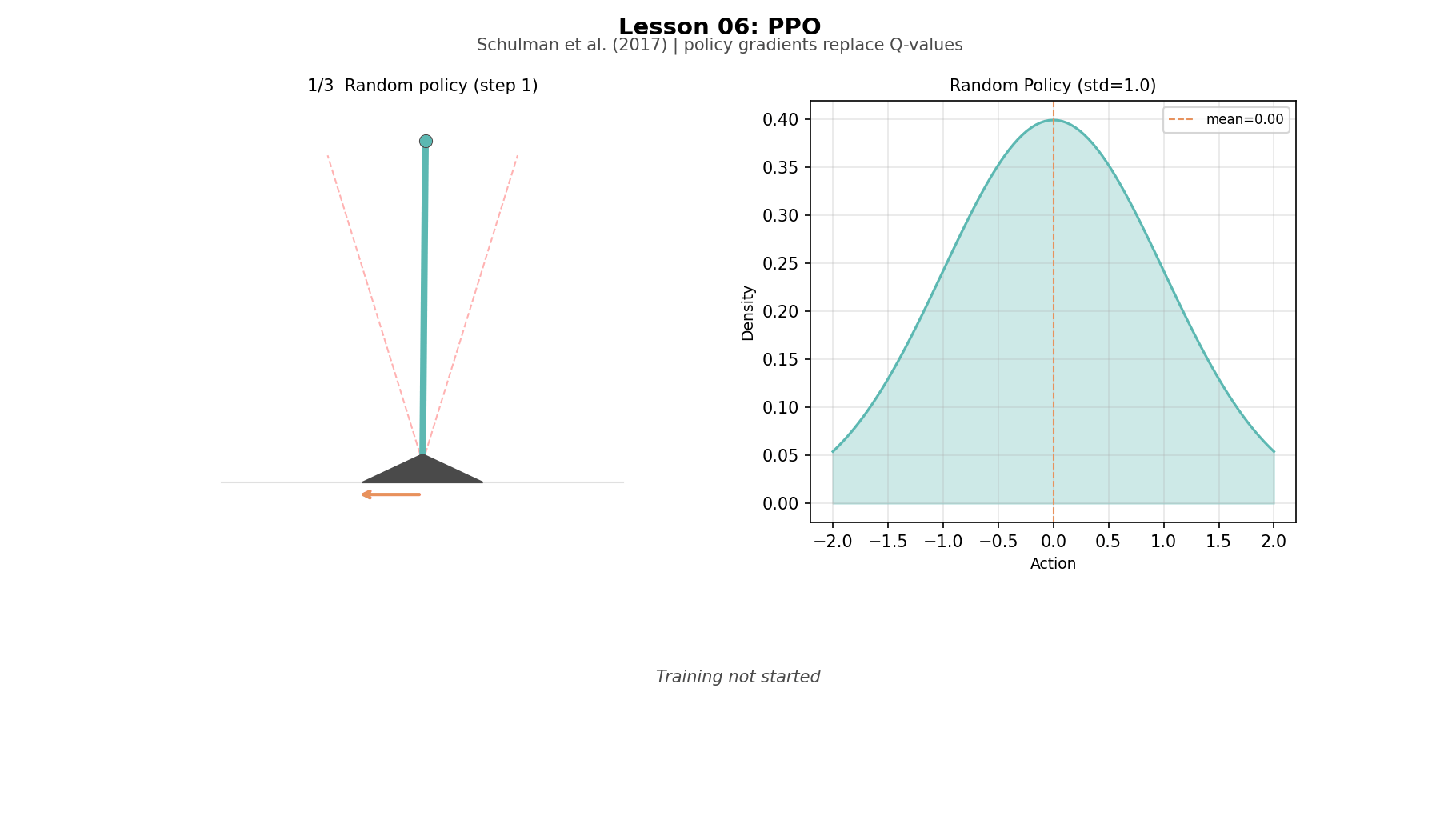 PPO: network(state) -> (mean=0.3, std=0.6) -> sample 0.47DQN's network outputs three numbers and the agent picks the biggest. PPO's network outputs a bell curve and the agent draws a random number from it. You cannot take argmax over an infinite range, but you can sample from a bell curve centered anywhere. This is what makes continuous actions possible.